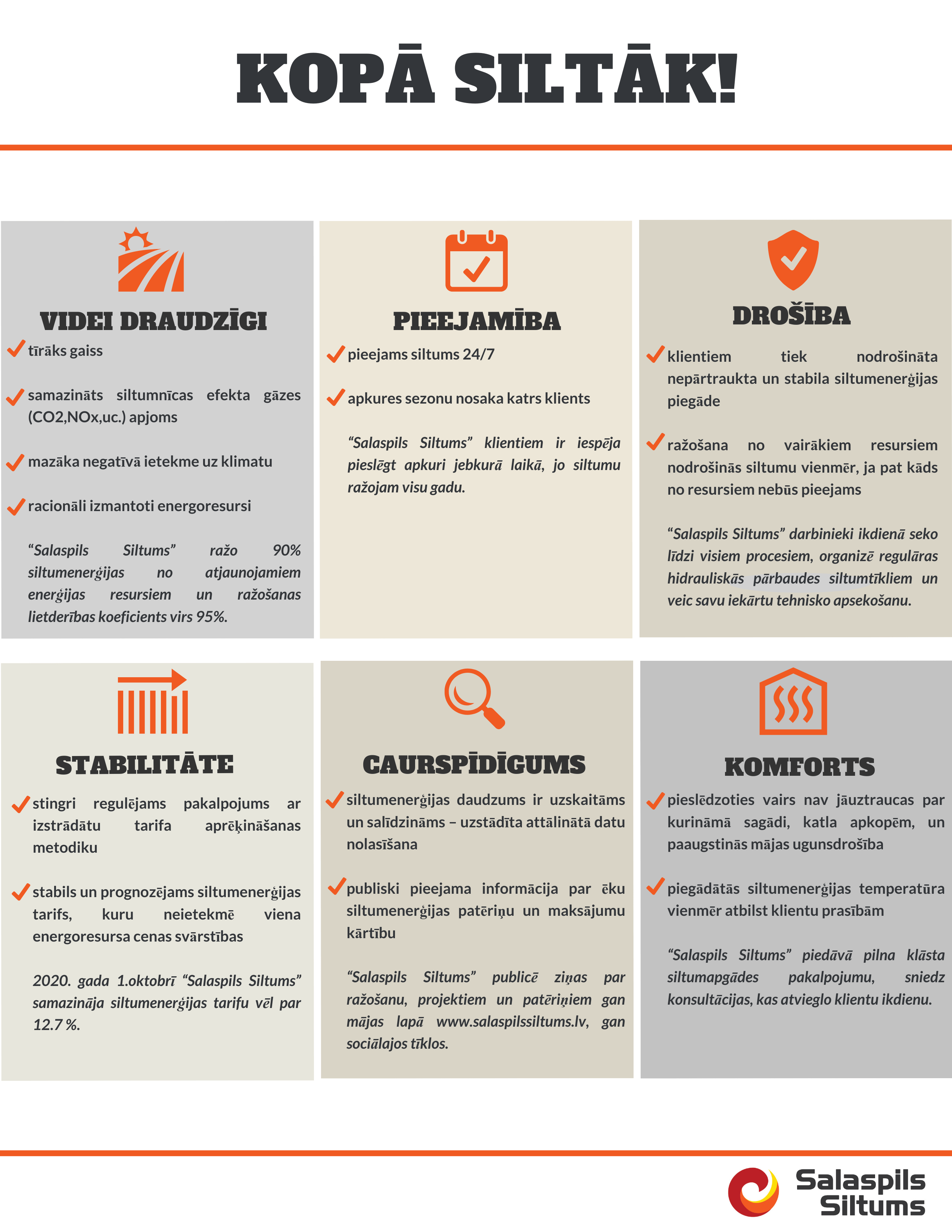 “Salaspils Siltums” ir inovatīvs un uz patērētājiem orientēts siltumapgādes uzņēmums ar daudzu gadu pieredzi. Atrodoties pastāvīgā attīstības procesā, uzņēmums spēj nodrošināt iedzīvotājiem mūsdienīgu un Eiropas energoefektivitātes standartiem atbilstošu siltumenerģijas piegādi.
